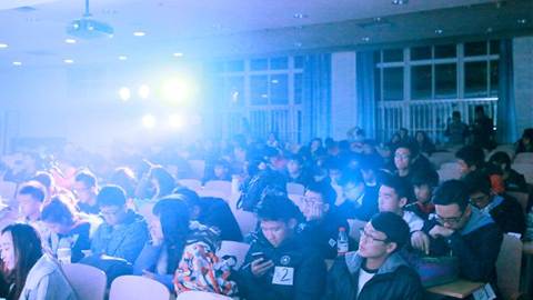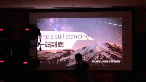 晚7:30,晚会正式开始。在同学们阵阵的欢呼声中,四位主持人闪亮登场。主持人首先表达了对到场嘉宾以及同学们的感谢,随后介绍了本次比赛的规则。比赛分为半决赛和决赛。半决赛20位选手首先通过抽签分为4个小组,每组5人展开激烈的车轮战,各组擂主进入决赛。四轮比赛中,B组2号苟世锟同学连胜同组四人晋级决赛上半场,博得观众的喝彩。半决赛中间设置了观众答题环节,获得答题机会的两名幸运观众不负众望,全部答对,得到了主办部门精心准备的礼品。最终,A组崔桐,B组苟世锟,C组周睿,D组樊祥和四位同学晋级决赛上半场。
