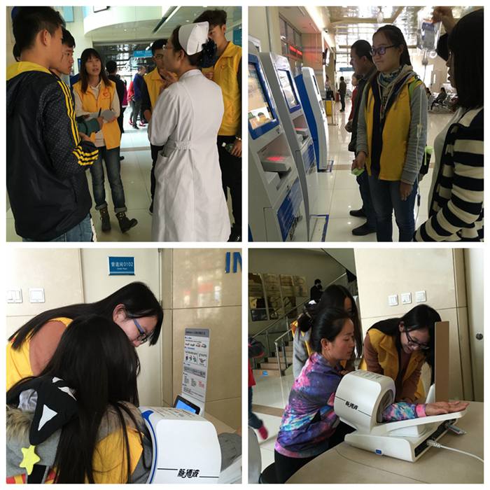 此次志愿服务的工作包括化验单打印、一体机使用、血压测量等内容。打印化验单的两位同学一边帮助患者通过刷卡的方式使用打印机,一边安慰旁边着急的患者。负责协助患者使用一体机的五位同学在大厅里的八台机器前,不厌其烦地解答大家的问题。帮助量血压的三名志愿者则细心地告诉患者如何把肘部放在正确的位置。同时,负责引导的四名志愿者也耐心地帮助遇到困难的患者及其家属。为了更好地帮助患者缩短看病时间,志愿者们都坚守在自己的岗位上,努力做好服务工作。每位患者在接受了志愿者的耐心帮助后,都露出了欣慰的笑容。